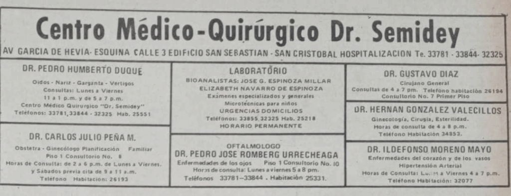 — Fue una idea de los doctores Nerio Rubio Villasmil, González Valecillos y Pepe Camero, los cuales empezaron a funcionar dentro de una casona, aquí cerca, en la calle 3 del sector Centro. Posteriormente, en el año 1965, decidieron construir un sitio mejor y más cómodo para la atención de sus pacientes, y entonces lograron hacer este edificio, trasladaron la clínica aquí al segundo piso del edificio San Sebastián, para convertirse en la clínica Semidey o en el Centro Médico Quirúrgico Semidey. Un edificio ubicado a pie del viaducto de la avenida García de Hevia.