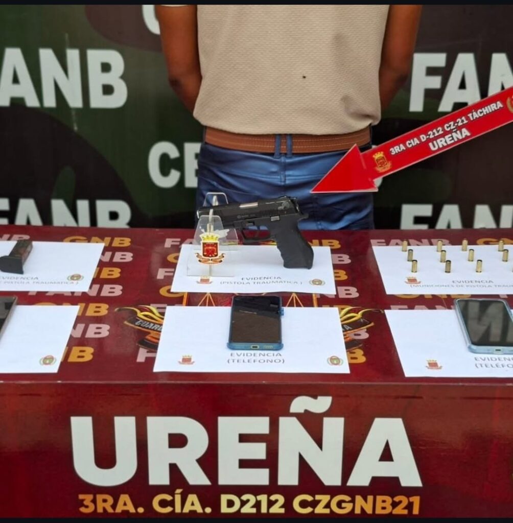 Un hombre fue aprehendido en la ciudad fronteriza de Ureña con un arma de fuego tipo traumática, un cargador de pistola y 14 cartuchos sin percutir, ocultos debajo de uno de los asientos del vehículo en el que se movilizaba.