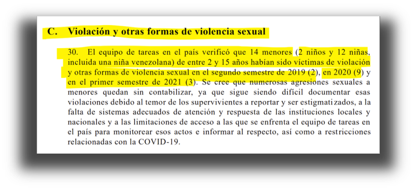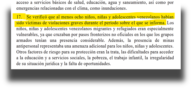 El instrumento evalúa a Colombia desde 2008, pero es desde 2021 que ante el Consejo de Seguridad de la ONU, informes del Secretario General, António Guterres, comienzan a detallar por vez primera los crímenes de guerra perpetrados contra la infancia y adolescencia migrante y refugiada venezolana en el país (1,2,3,4,5, 6).