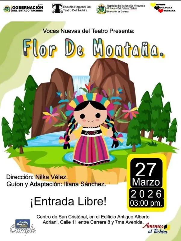 El grupo infantil “Voces Nuevas del Teatro” presentará la obra: “Flor de Montaña”, dirigida por Nilka Vélez, una pieza inspirada en la leyenda del Chorro del Indio que resalta nuestro patrimonio cultural.