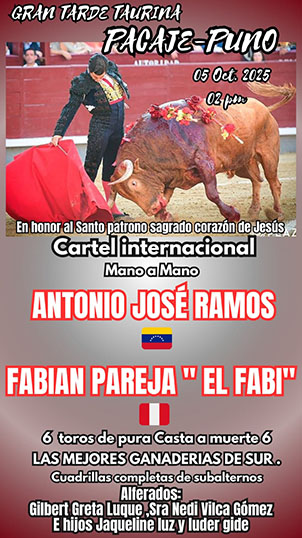 La primera cita de Ramos tendrá lugar en la localidad de Pacaje, Puno, el próximo domingo 5 de octubre de 2025. En esta ocasión, el venezolano se medirá en un emocionante Mano a Mano con el torero peruano Fabián Pareja, conocido como “El Fabi”. El cartel se enmarca en la “Gran Tarde Taurina en honor al Santo Patrono Sagrado Corazón de Jesús” y anuncia la lidia de seis toros de pura casta, procedentes de las mejores ganaderías del sur, garantizando un espectáculo de máxima exigencia.