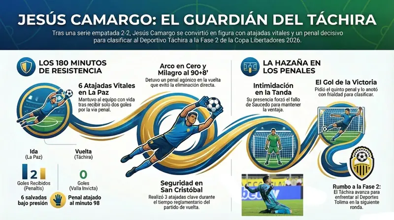Y en este suspenso de los miles de aficionados en las tribunas apareció otra vez la figura de Jesús Camargo, anotó el último penal para el 5-3 definitivo, la clasificación a la segunda fase de Copa Conmebol Libertadores dónde se verá las caras con Deportes Tolima, de Colombia, juego de ida el jueves 19 de febrero en el estadio Pueblo Nuevo.