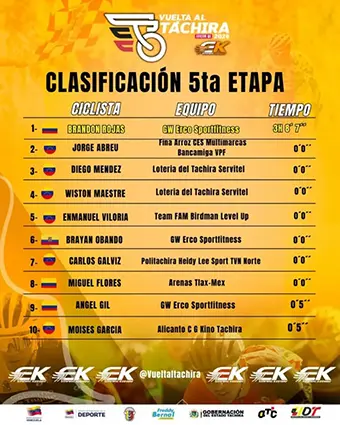Lo destacable en la quinta etapa, los segundos que descontaron en la raya de meta, Jorge Abreu (35), ficha del equipo Fina Arroz Multimarca Bancamiga, y Diego Méndez (19) al servicio del equipo Lotería del Táchira, al lider Viloria, que con el correr de los kilómetros apuntan como opcionados al trono que ostenta el merideño Eduin Becerra, campeón en 2025.