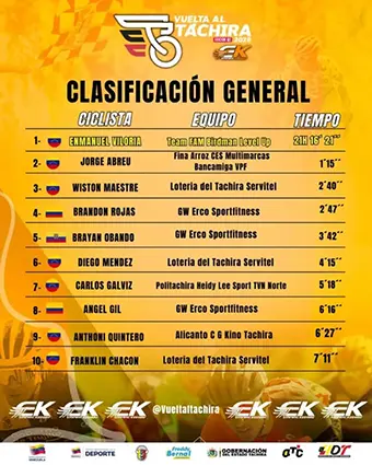 Sin embargo, será a partir de este miércoles cuando empiece a despejarse el camino, de que están hechos quienes conforman el Top10 de la clasificación general. La cuesta final del liceo Militar Jáuregui; el cerro Cristo Rey de Capacho e incluso la etapa de cierre, partiendo de Ureña y final en el Velódromo de Pueblo Nuevo definirá el campeón, si levanta el trofeo un experimentado como Jorge Abreu o si Diego Méndez da el zarpazo, se erige como uno de los futuros ases del pedalismo venezolano, con calidad de exportación.