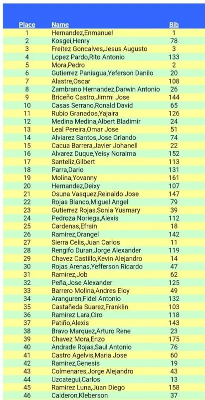 En la parte competitiva, los amantes de las carreras de fondo pudieron observar el gran duelo entre el Enmanuel Hernández y el keniano Henry Kosgei, quienes a la postre hicieron el 1-2 en la meta, el tercer lugar para Jesús Augusto Freitez Goncalves, cuarta casilla para Rito Antonio Pardo y el top 5 para el tachirense Pedro Mora.