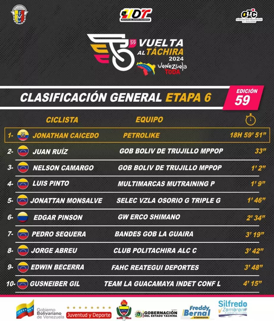 La otra cara de la moneda en el lote del líder, Jonathan Caicedo, un ecuatoriano con miles de kilómetros en sus piernas, con presencia en las principales carreras por etapas del universo, dejó claro que vino por la corona, resistió a todos los embates, especialmente de su archirrival equipo Gobierno Bolivariano de Trujillo, en la humanidad de sus dos cartas crédito: