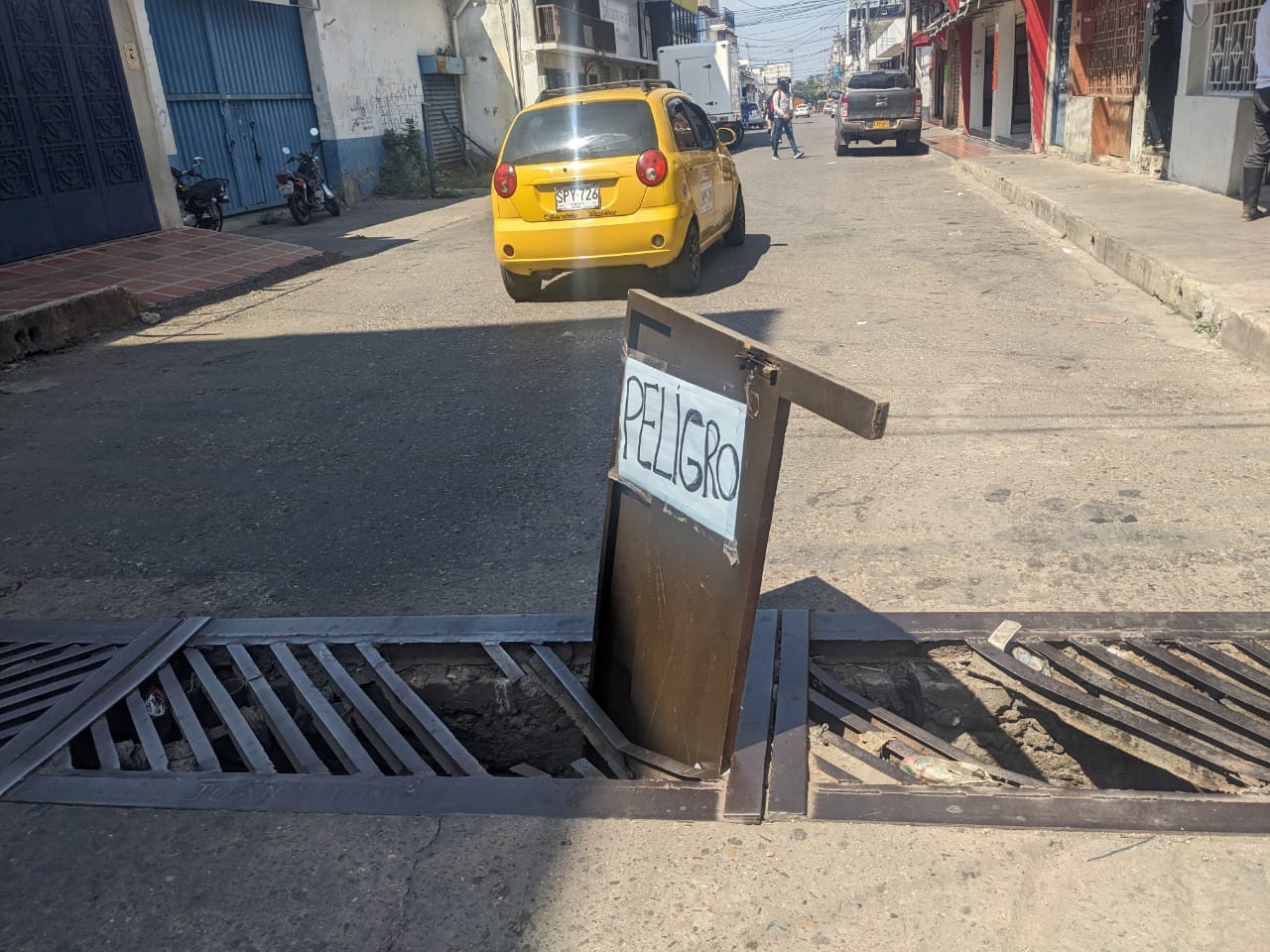 En la calle 5, a una distancia no mayor de dos cuadras y media de la avenida, se divisa un aviso con la palabra “peligro”. Es la forma con la que vecinos y dueños de locales se la ingeniaron para llamar la atención de conductores y peatones. “Nadie ha venido a revisar la alcantarilla”, aseguraron.