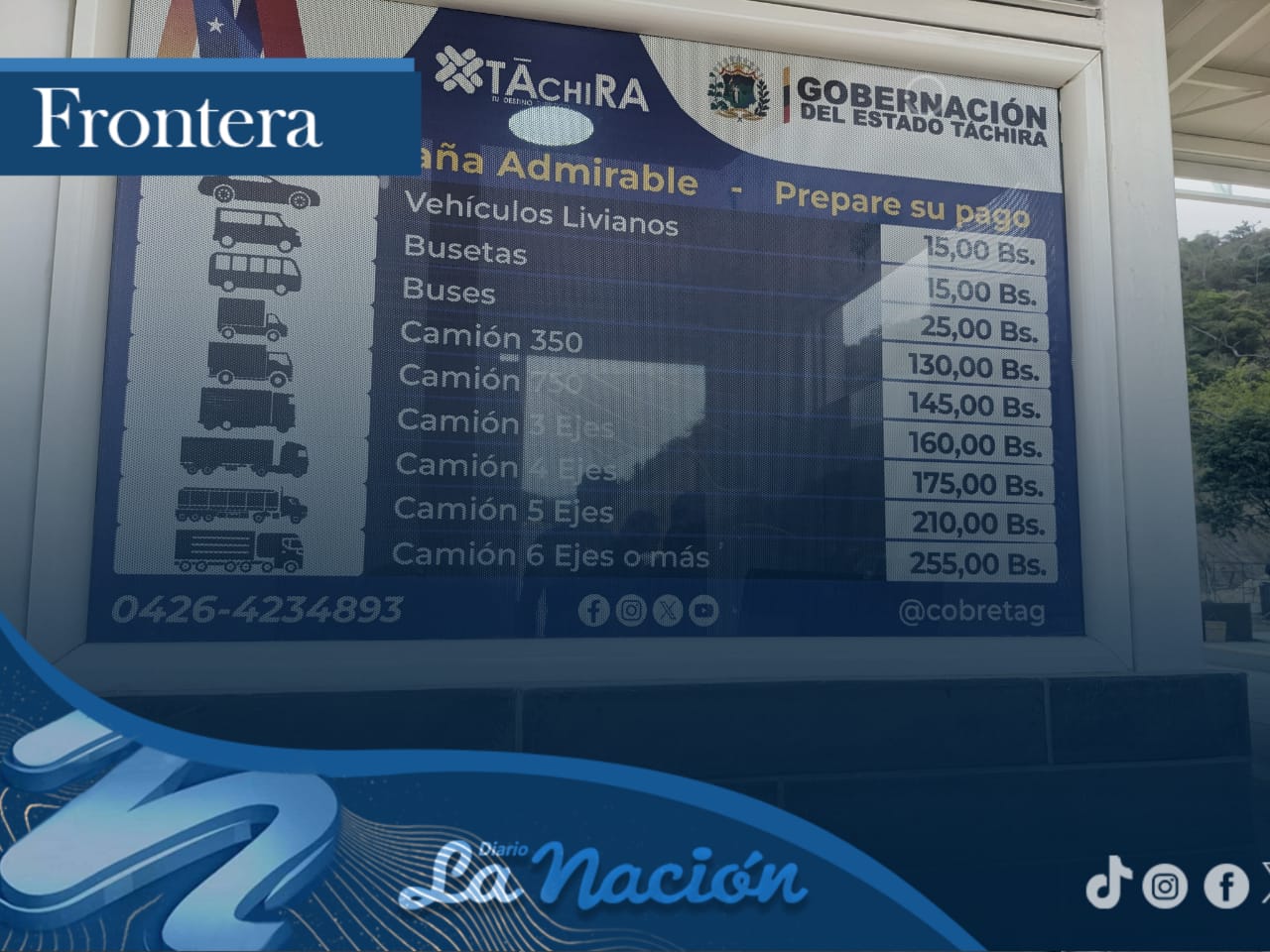 En bolívares, los precios quedaron estipulados en Bs 15 para vehículos livianos, al igual que las busetas, mientras que los buses en Bs 25. El camión 350 (Bs 130), camión 750 (Bs 145), camión 3 ejes (Bs 160), camión 4 ejes (Bs 175), camión 5 ejes (Bs 210) y camión 6 ejes o más (Bs 255).