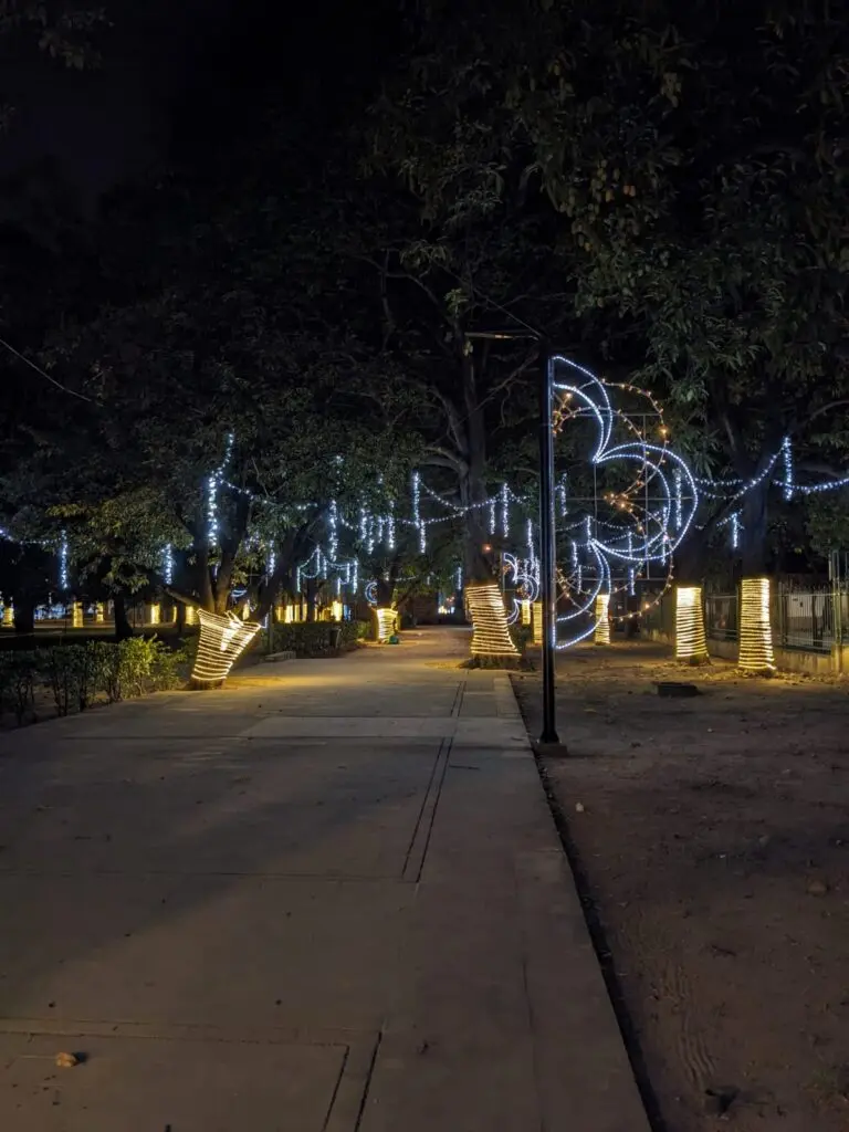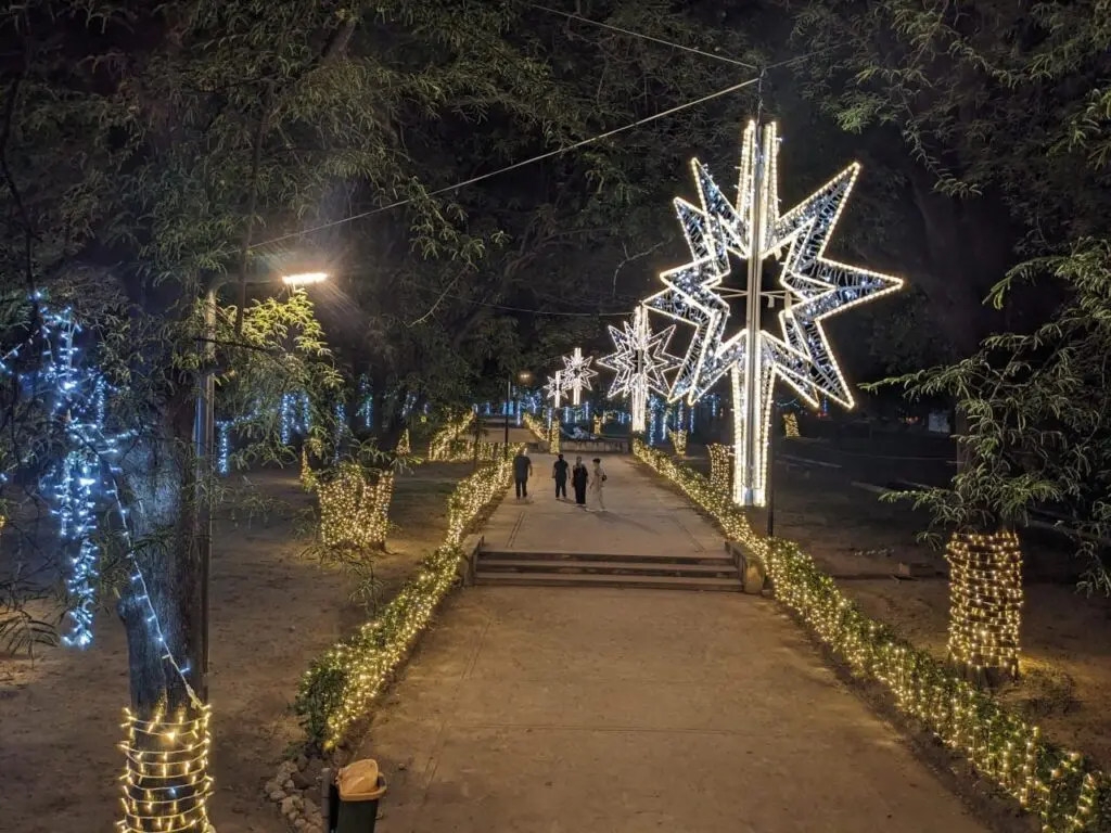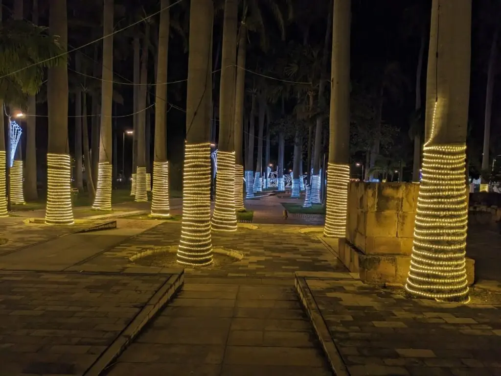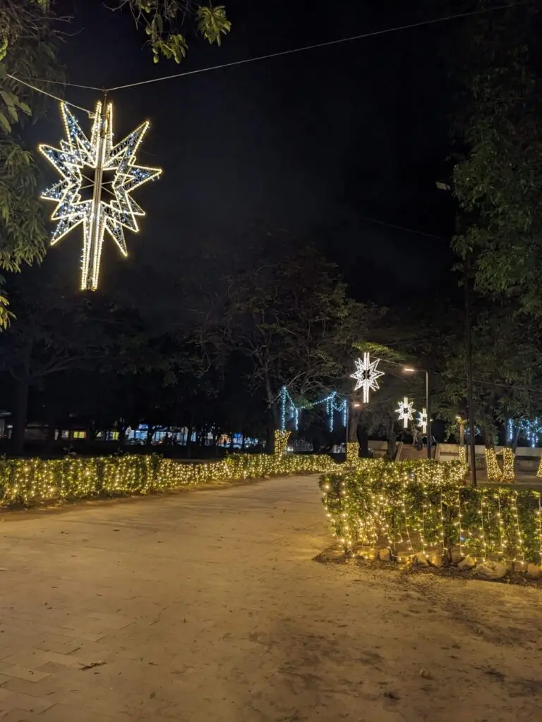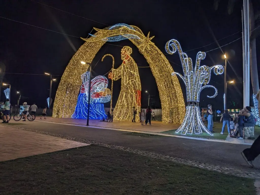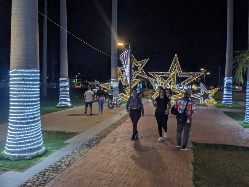 Las palmeras también resaltan por las luces amarillas y blancas que envuelven parte de sus troncos. Más adelante, un conjunto de enormes estrellas les permiten a grupos familiares posar para una postal navideña.
