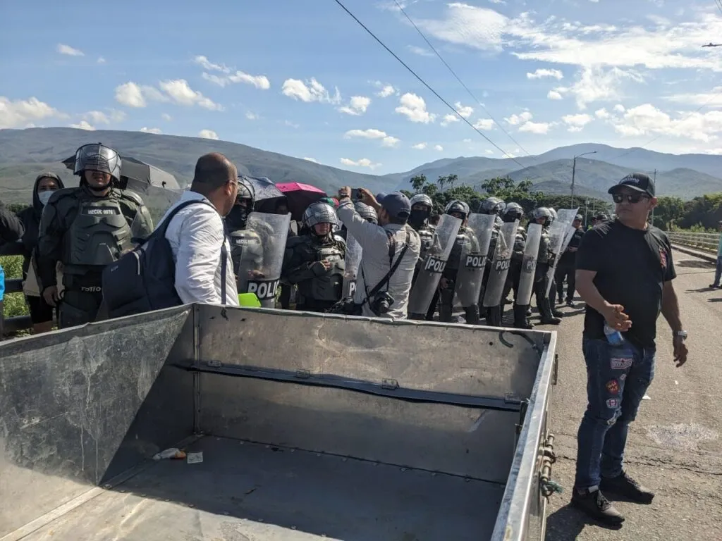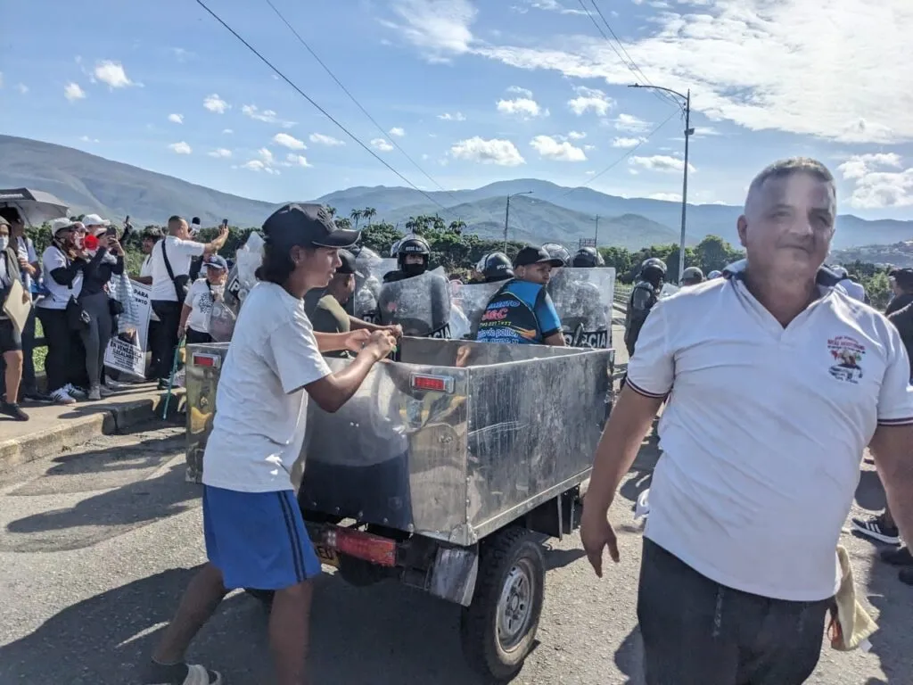 Comerciantes informales de La Parada rompieron este viernes el cordón de la policía antimotines y retiraron a la fuerza a manifestantes que exigen en protesta la liberación de sus familiares colombianos detenidos en Venezuela.