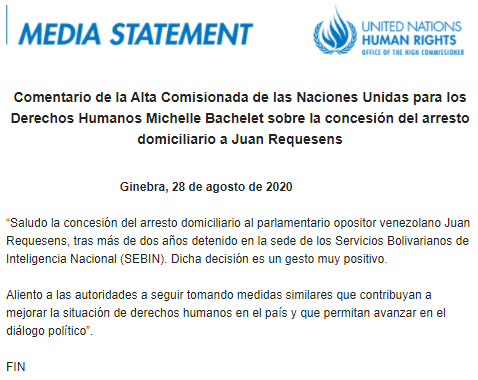 La Alta Comisionada de los Derechos Humanos de la ONU, Michelle Bachelet, calificó como un “gesto muy positivo” la medida de casa por cárcel otorgada al diputado Juan Requesens.
