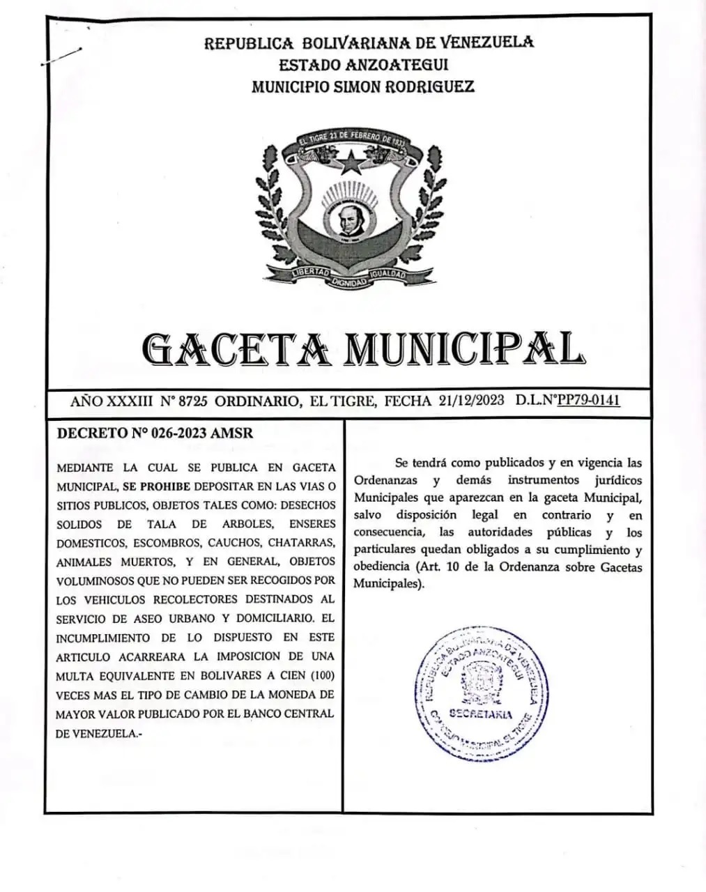 Mediante el decreto N.-026-2023 AMSR, publicado en Gaceta Municipal, la alcaldía de la localidad anunció este martes 26 de diciembre que está prohibido depositar desechos sólidos en las vías, avenidas o sitios públicos de la ciudad.
