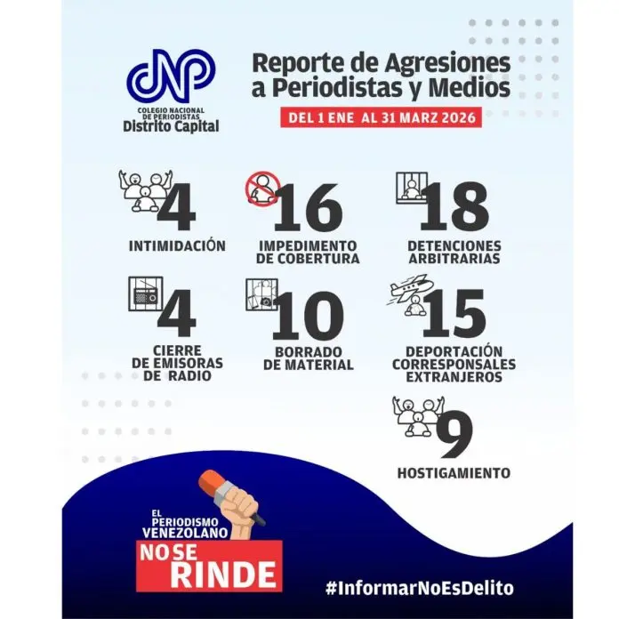 El reporte de agresiones a periodistas y medios detalla una estrategia que combina el hostigamiento directo y bloqueos tecnológicos. El gremio desglosa de la siguiente manera los incidentes documentados entre el 1 de enero y el 31 de marzo de 2026: 18 detenciones arbitrarias y 15 deportaciones de corresponsales extranjeros, así como 9 casos de hostigamiento, 10 de borrado de material y 16 de impedimento de cobertura; se suman a esta estadística 4 casos de intimidación y el cierre de 4 emisoras de radio.