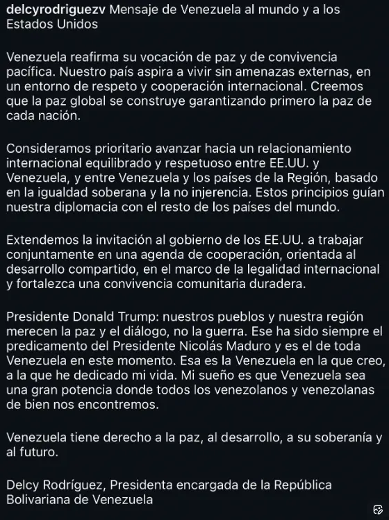 «Extendemos la invitación al Gobierno de los EE.UU. a trabajar conjuntamente en una agenda de cooperación, orientada al desarrollo compartido, en el marco de la legalidad internacional y fortalezca una convivencia comunitaria duradera», señaló Rodríguez en un comunicado publicado en Telegram.