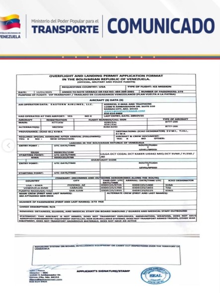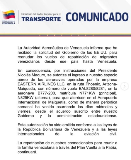 “Por instrucciones del Presidente Nicolás Maduro, se autoriza el ingreso a nuestro espacio aéreo de las aeronaves operadas por la empresa EASTERN AIRLINES LLC, en la ruta Phoenix, Arizona- Maiquetía, con número de vuelo EAL8280/8281, en la aeronave B777-200, matrícula N771KW (principal), N825KW (alterna), para que aterricen en el Aeropuerto Internacional de Maiquetía, como de manera periódica semanal ha venido ocurriendo los días miércoles y viernes, desde el acuerdo suscrito entre nuestro Gobierno y la administración estadounidense”, publicó la Inac en su cuenta de Instagram.