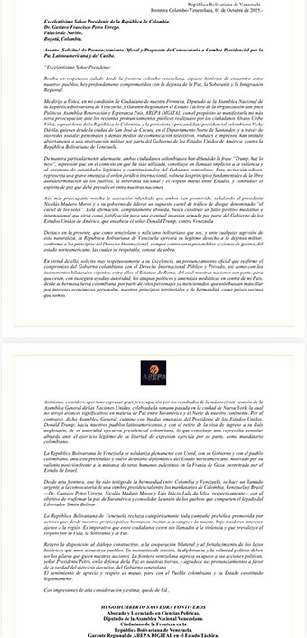 Hugo Saavedra, diputado de la Asamblea Nacional (AN) por el estado Táchira, remitió una carta formal al presidente de la República de Colombia, Gustavo Petro, solicitando un pronunciamiento oficial de Bogotá ante lo que considera una “grave amenaza” a la paz de Venezuela.