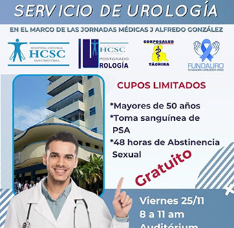 Campañas de Despistaje Gratuitas: El sábado 15 de noviembre se llevó a cabo una jornada de despistaje de cáncer de próstata en el Urológico 2000, y el próximo está pautado Hospital Central de San Cristóbal para el próximo jueves, 20 de noviembre.