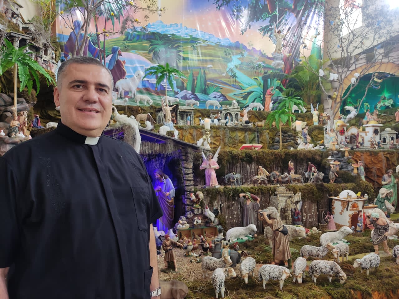 Durante cinco días, los colaboradores y ayudantes del padre Jorge dedicaron su esfuerzo para materializar este impresionante pesebre, que también sirve como altar para las celebraciones litúrgicas.