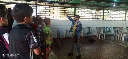 De una manera muy dinámica de un ensayo entre todos los asistentes de la canción “Moliendo Café”, se discurría a una escucha atenta de Mozart y Vivaldi, brotando de un pequeño reproductor traído consigo por el profesor, y de ahí a los instrumentos que los mismos niños y niñas habían hecho, ya fuera una botella llena de piedritas, o un vaso plástico en el que resonaba el roces con dedos mojados de un hilo adherido a este.