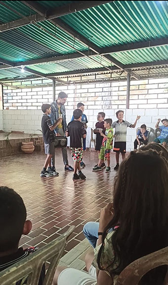 Distintas edades pero una misma emoción, en una sola “troupe” que, bajo la convocatoria de tres de sus maestros, suspendió sus juegos vespertinos para ir al encuentro del profesor, con quien durante esa semana han retomado la lección, luego de unos meses de ausencia, cuyo objetivo principal ha sido el que ellos se den cuenta que la música brota de sus cuerpos y de cualquier objeto que manipulable para producir sonido.