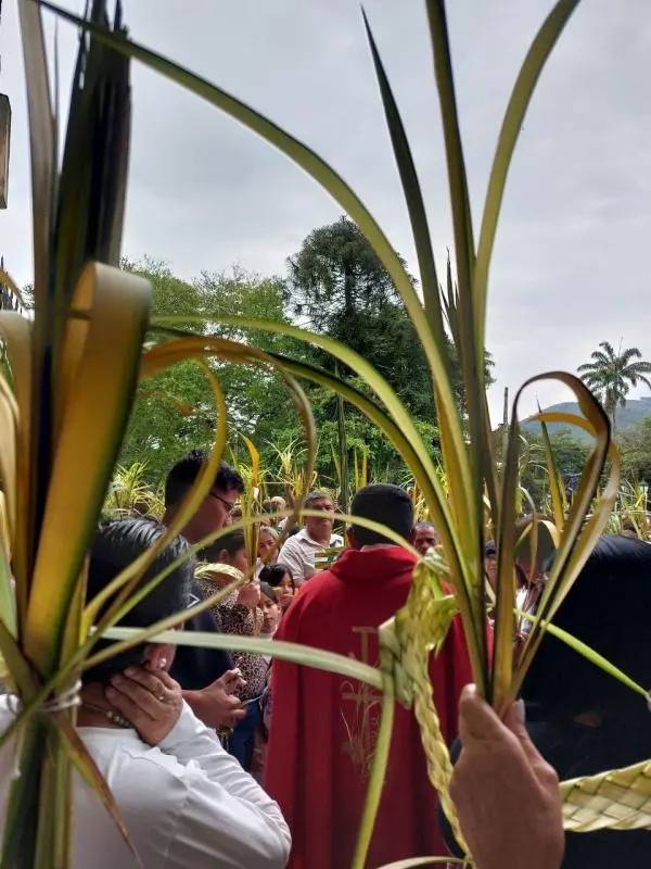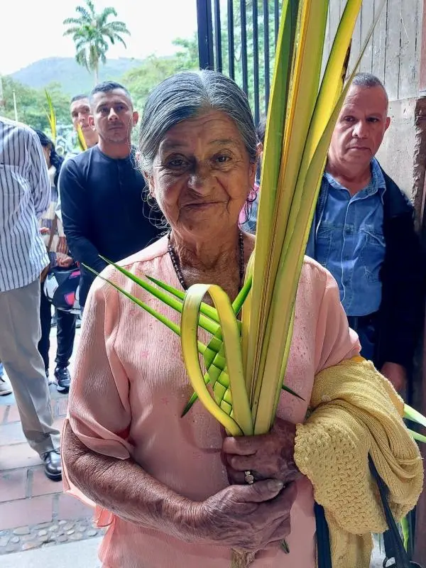Palmas en alto, bajo un cielo gris que amenazaba lluvia, los fieles se concentraron en el atrio de la iglesia Santa Bárbara de Rubio, a la espera del agua bendita, que el Padre Richarger Ávila salpicaba con un hisopo sobre la multitud, para después leer un pasaje del evangelio.