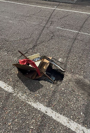El hueco de la vía fue parcialmente llenado con escombros y señalizado. Por su parte, el de la acera fue cubierto con ladrillos y piedras. Ambas medidas fueron tomadas por los vecinos para evitar accidentes.