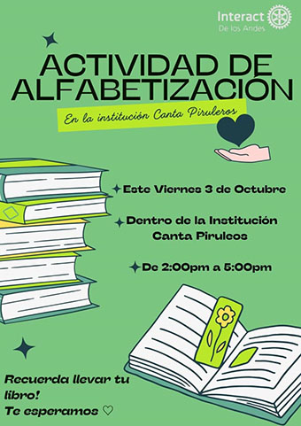 Enmarcada en el mes de la alfabetización rotaria, los jóvenes del club tienen previsto el desarrollo de diferentes dinámicas de lectura y recreación para los pequeños de la institución. Interact de Los Andes es una organización sin fines de lucro perteneciente al Rotary, cuyo lema es “crear esperanza en el mundo”.