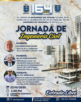El Centro de Ingenieros del estado Táchira invita a la comunidad estudiantil y profesional a participar en el evento: Jornada de Ingeniería Civil, para celebrar los 164 años del Día del Ingeniero en Venezuela.