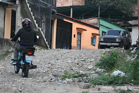 El tramo que intervino la municipalidad recientemente es muy inestable e impide el paso de cualquier vehículo motorizado con seguridad. Las grietas en el relleno denotan que el terreno sigue cediendo. “Desde aquí hasta allá lo hicimos nosotros, cavamos casi dos metros buscando la tubería vieja y se la pusimos. Todo bien, para que vinieran y metieran tuberías de aguas negras y limpias. La alcaldía nos ha dado apoyo, pero mire lo que nos falta: las aceras y culminar la calle”, destaco Jaime Villamizar.