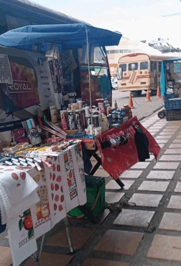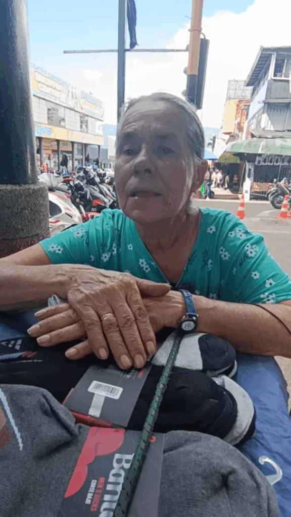 — Aquí mi esposo vende caramelos, y yo vendo aquí ropa. Eso nos ayuda a llegar. Sí, poco a poco ahí vamos a seguir adelante — expresa mientras muestra su espacio de venta.