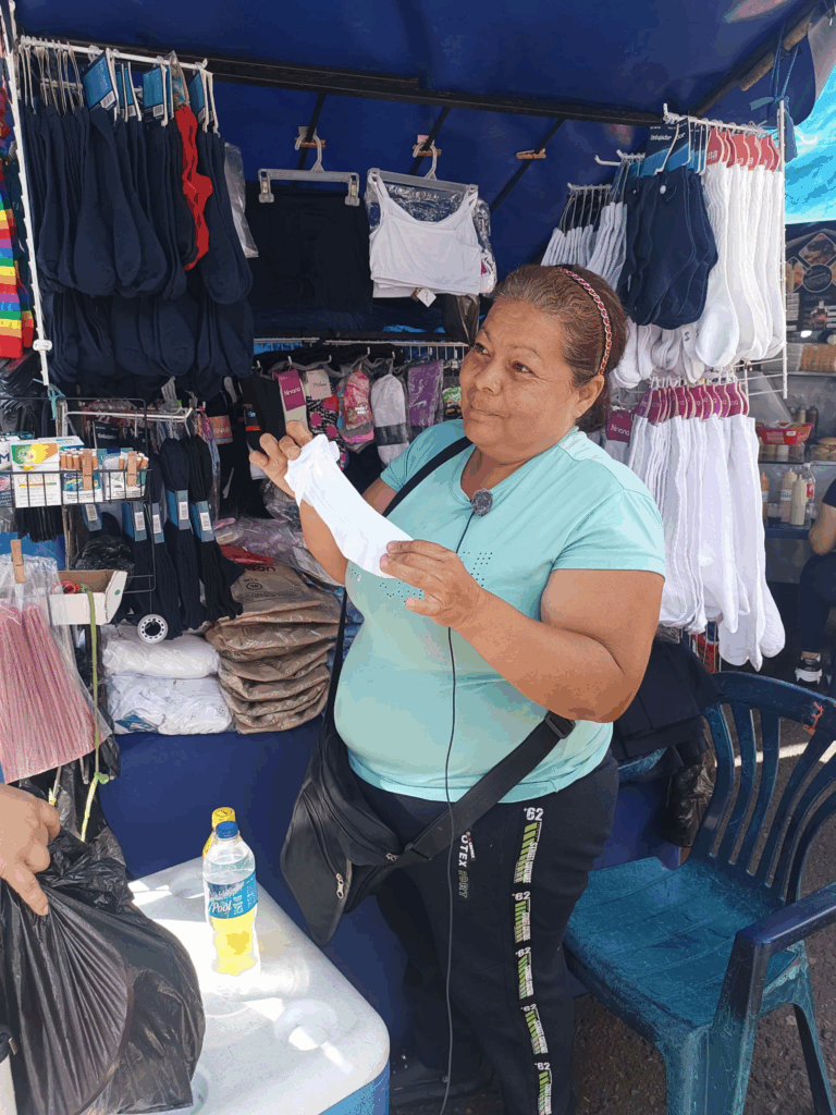 — Bueno, yo empecé en la calle vendiendo, con mi esposo, caramelos y eso, ayudándole a él. Luego comencé a vender otras cosas, primero con un poquito de medias, después empecé a meter de cada cosita un poquito, de ropa interior, y así voy vendiendo hasta el momento.