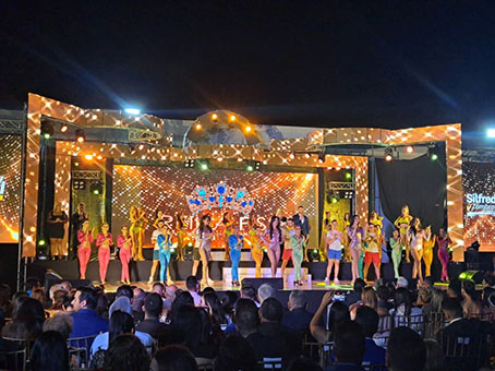 Las barras de las aspirantes retumbaron con la interpretación del emblemático tema Gochilandia Park, que hizo que los asistentes a la gala de la belleza se levantaran de sus asientos para saltar y cantar al unísono la canción estrenada en el año 2012, la cual sirvió como preámbulo para que las 13 aspirantes al título salieran al escenario con trajes de luces alusivos a los toreros, en homenaje a la tradición taurina de la Feria.