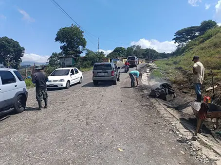 Por Santa Elena se encuentra el primer punto afectado en la ruta entre El Mirador y El Pueblito. Vecinos de la zona hacen bacheo de forma rudimentaria con el fin de solucionar, de manera provisional, daños ocasionados en la carretera consecuencia de hundimientos y deslizamientos activos que se han presentado desde hace varios años.