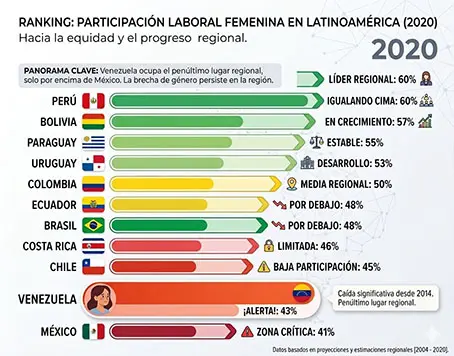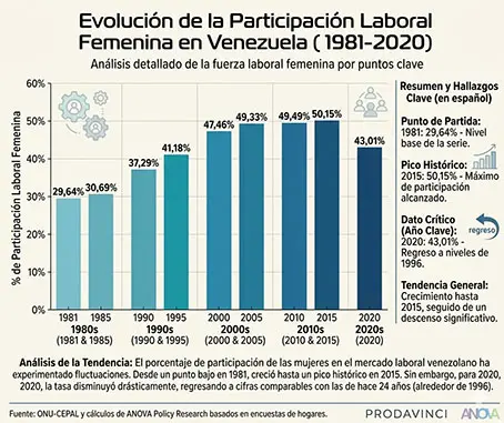 La participación de las mujeres en el mercado de trabajo venezolano ha sufrido una caída estrepitosa, posicionando al país en los últimos peldaños de la región latinoamericana. Según Rojas, “la participación laboral femenina en Venezuela cayó un 43 %, un nivel que no se veía desde finales de los años 90”, lo que nos coloca actualmente solo por encima de Guatemala en esta métrica.