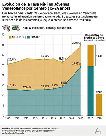 En la segunda entrega del trabajo especial “Autonomía perdida”, hecho en coautoría con Francis Peña, se destaca que en el país para 2020 la porción de mujeres, entre los 15 y 24 años, que ni estudia ni trabaja de manera formal, prácticamente alcanzó el 40 % de la población, 11 puntos porcentuales por encima de sus pares masculinos. Un grupo erróneamente etiquetado de forma peyorativa como “ninis”. Rojas aclaró que estas jóvenes no están inactivas por elección, sino que “son víctimas de un sistema que no las está apoyando ni las está motivando para poder sumarse al campo laboral. Es además importante destacar que sí tienen trabajo, solo que no es remunerado”, refiriéndose a las labores de cuidado que deben asumir, a veces incluso reemplazando a padres o familiares que han migrado.