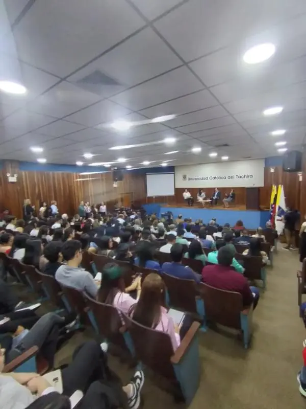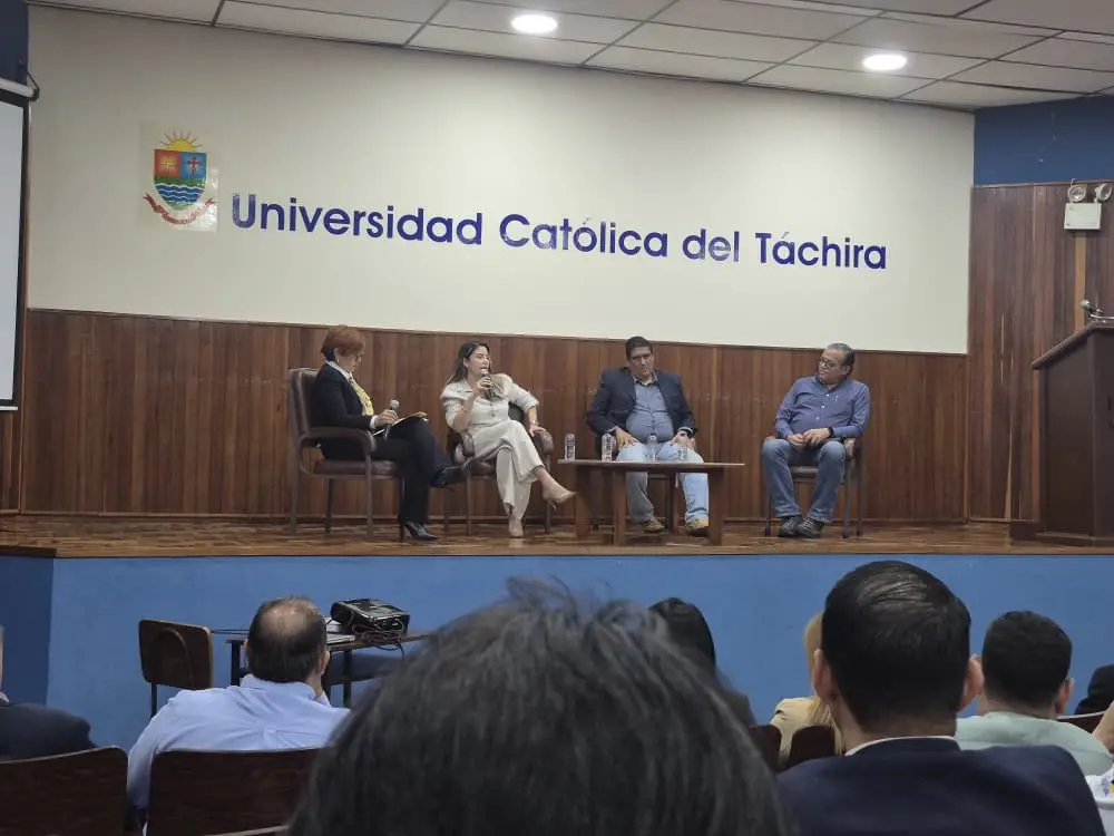 Yensy Meneses, representante de la Universidad Católica del Táchira (UCAT), destacó la importancia de la unión institucional entre Fedecámaras Táchira, la Cámara de Comercio e Industria del Estado, Fundesta y la UCAT para lograr un auditorio abarrotado que refleja el interés colectivo en el tema.