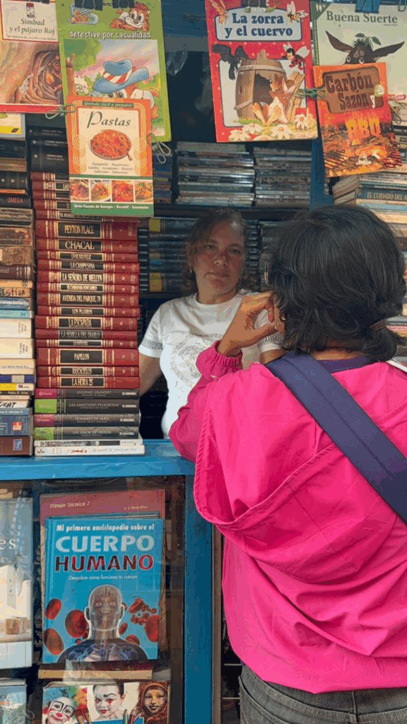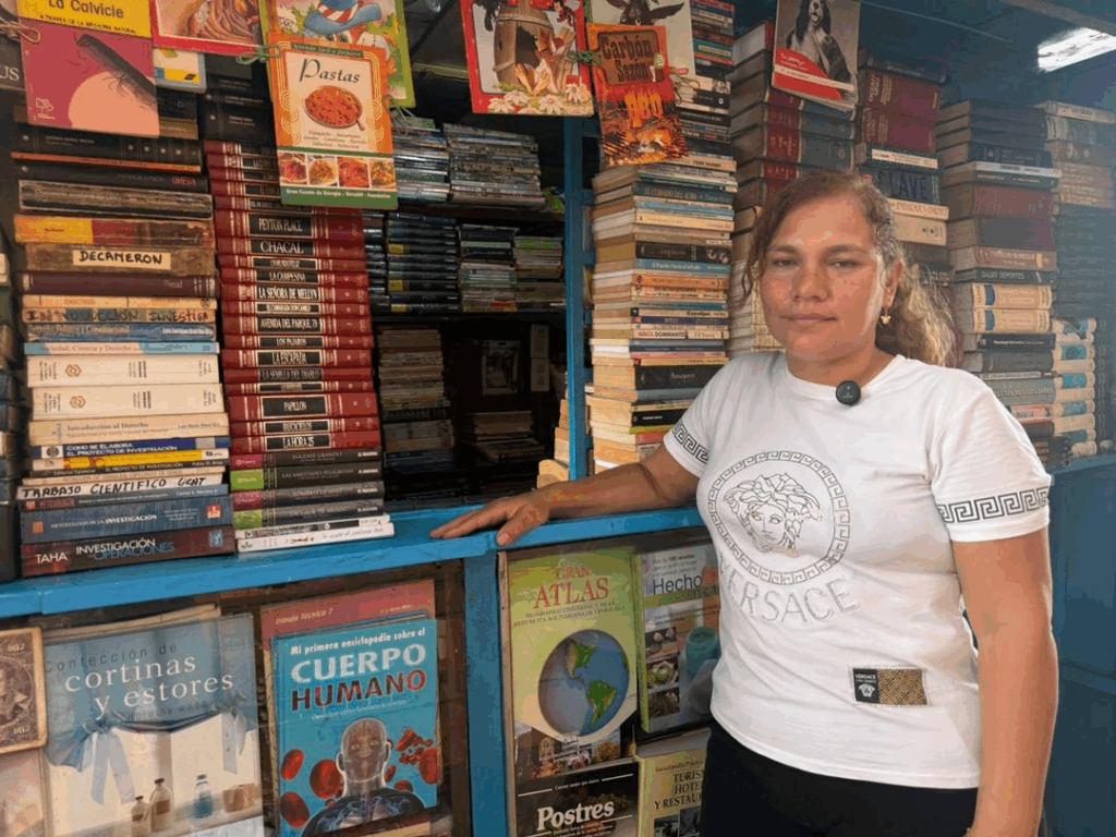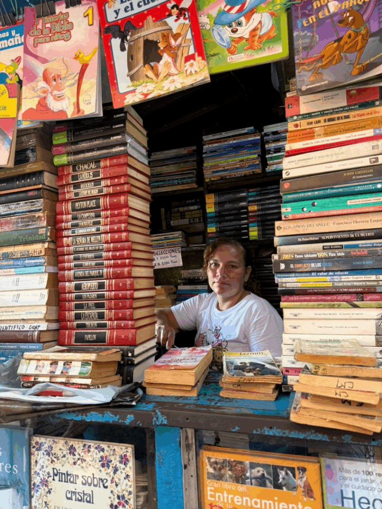 — A la orden, ¿desea comprar algún libro? – Pregunta Isis Rivera a una señora bajita que se acercó a la ventana. Su voz dulce sobresale entre el ruido de los transeúntes – Tengo desde libros religiosos hasta recetarios de cocina. Sí busca novelas también se las tengo. Hay bastantes de romance.