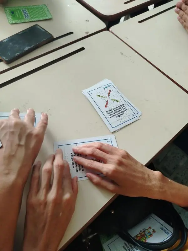 Cuando llega a la pregunta que cuestiona el origen de la información, de inmediato dice que la fuente no es oficial, y al conseguir la tercera carta, que argumenta que no se puede confiar en un contenido basado en un rumor, logró hacer el trío y gritó ¡Cotejado! Durante la mañana, mientras jugaban, practicaron la lectura usando el código Braille, aprendieron a identificar fuentes y contenidos engañosos, y desarrollaron criterios para determinar cuándo es una noticia real.