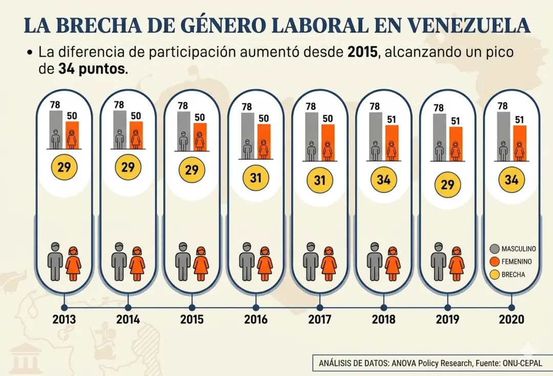 La participación de las mujeres en el mercado de trabajo venezolano ha sufrido una caída estrepitosa, posicionando al país en los últimos peldaños de la región latinoamericana. Según Rojas, “la participación laboral femenina en Venezuela cayó un 43 %, un nivel que no se veía desde finales de los años 90”, lo que nos coloca actualmente solo por encima de Guatemala en esta métrica.