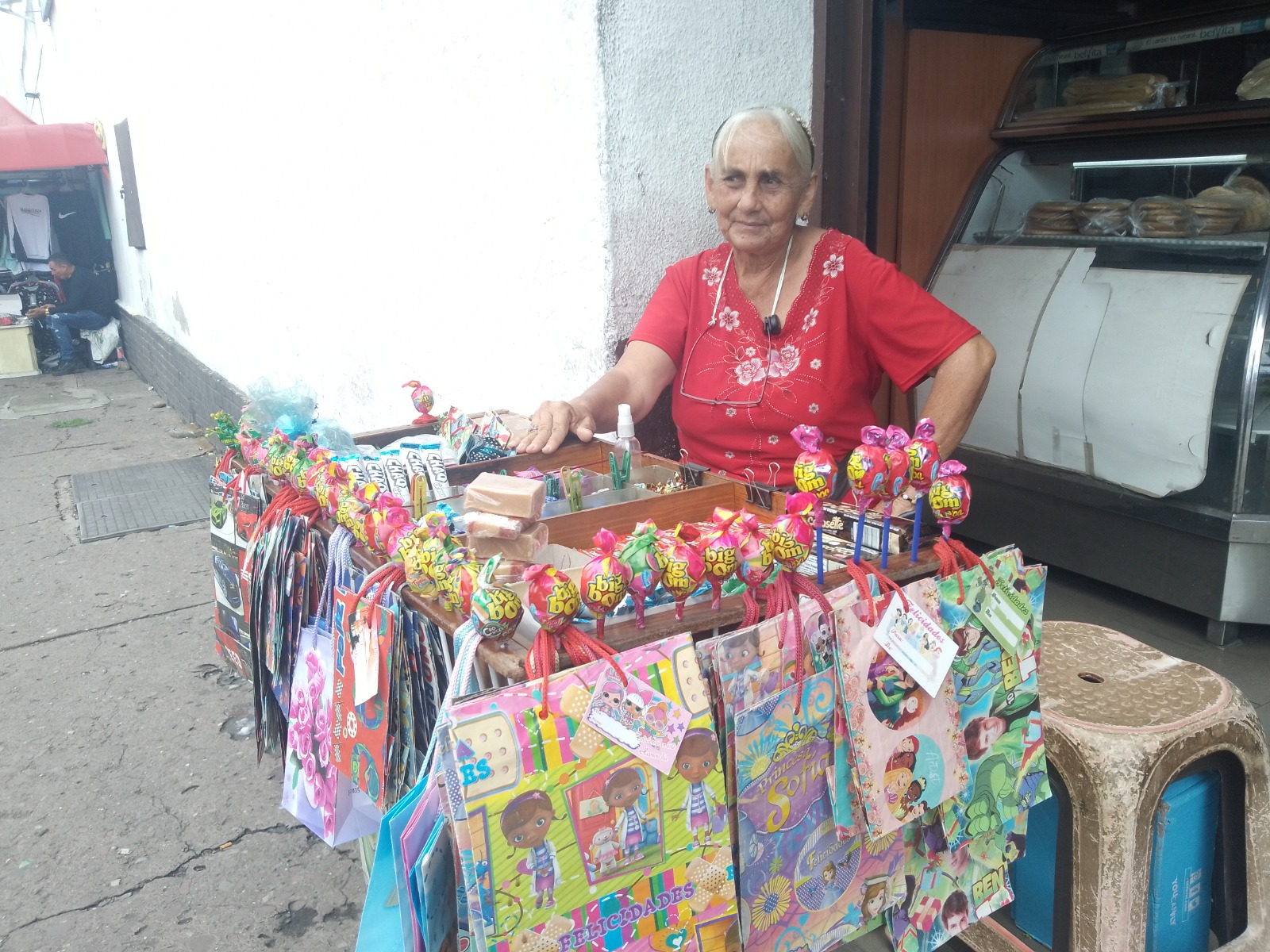 Resguardada bajo la estructura de la panadería San Cristóbal, en la calle seis, se encuentra la señora Olga Leal. Con 35 años de trabajo en la avenida, se ha convertido en un ejemplo de perseverancia y transición. Desde sus 40 años se ha mantenido en la misma carrera, entre las calles 6 y 7, más no con los mismos servicios. Inició en los años noventa, a un par de pasos de su puesto actual, donde anteriormente se ubicaba un teléfono público, de los de Cantv.