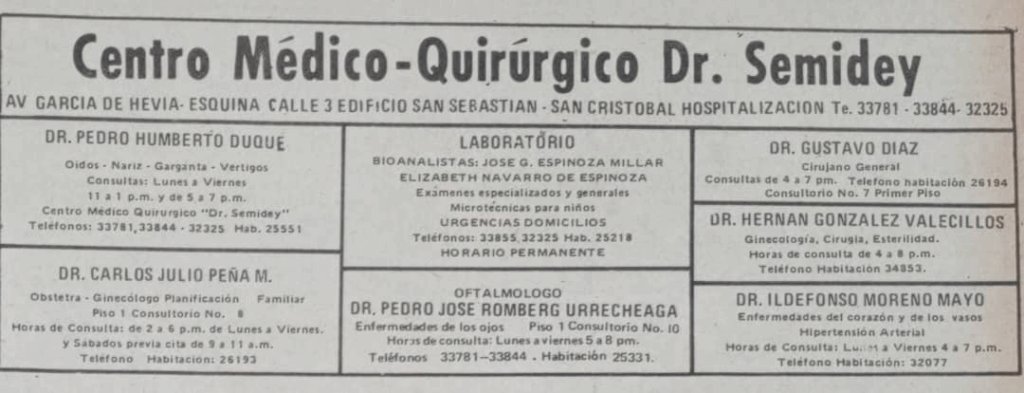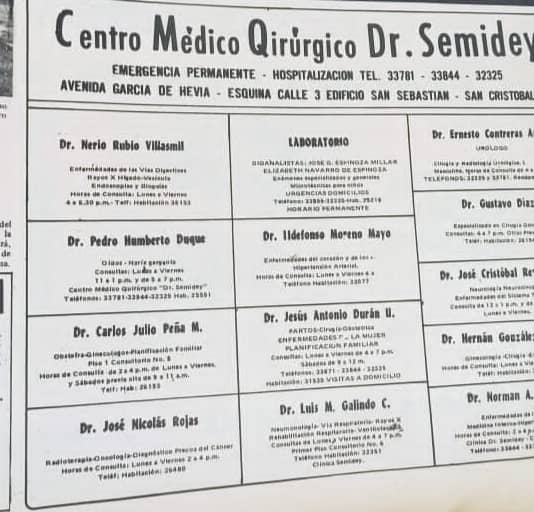 — El doctor Domingo Semidey fue uno de los primeros médicos, en la San Cristóbal de antaño, que vino a ejercer aquí al estado Táchira, junto con los doctores Romero Lobo y un grupo de médicos desde el Hospital Vargas, que quedaba en la calle 16, y desde donde empezaron a ofrecer sus servicios médicos a toda la colectividad del Táchira.