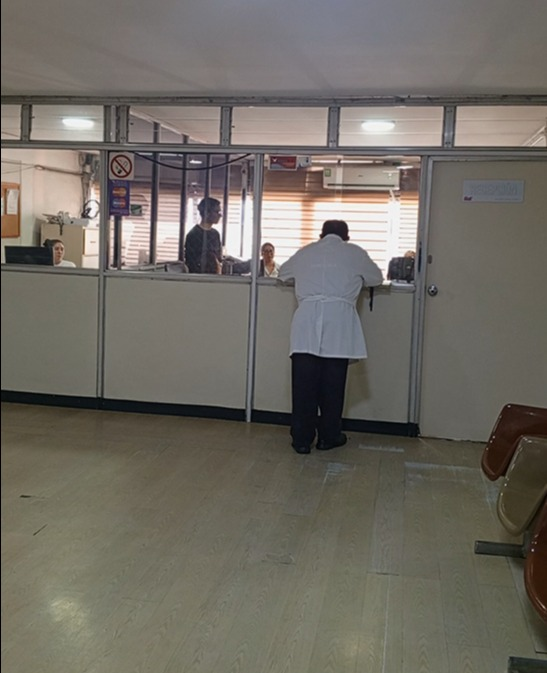 La sala de espera, con dos hileras de sillas, una al frente de la otra, con asientos alusivos a la década de los años sesenta, de forma ovalada y colores tenues, tonalidad acorde con la iluminación de ese espacio. También se encuentra la recepción y oficinas administrativas separadas de la zona de espera por puertas y paneles con vidrios en la parte superior que permiten la visibilidad hacia su interior desde casi cualquier parte.