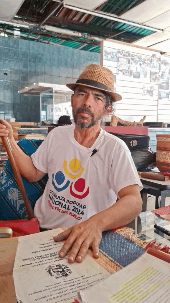 Continuando con el recorrido del lugar, Rolando avanza sus pasos a la entrada de la comuna, y justo, cuando se detiene al lado de una estructura metálica en donde se exhiben varias artesanías, se escucha a lo lejos la voz de un hombre.
