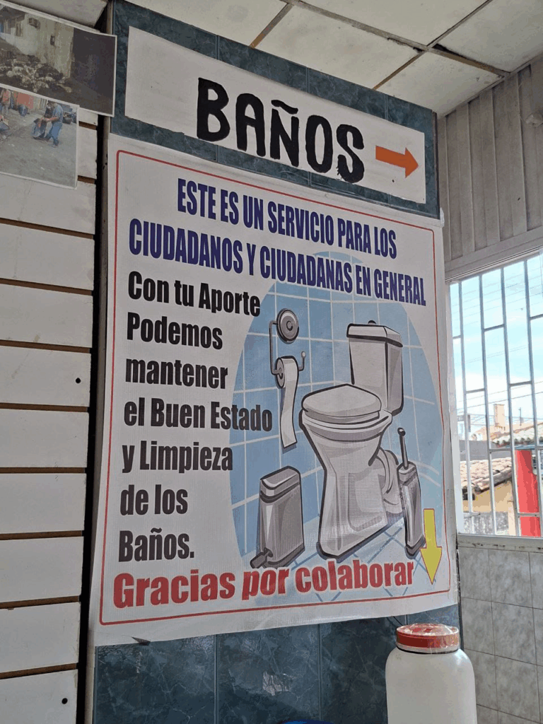 — Uno de nuestros fuertes aquí es el servicio del baño. -comenta Céspedes- Es muy necesario en la ciudad; nosotros estamos pensando siempre en los transeúntes, así como en nuestros vecinos — narra “El Gato”, paseándose por las instalaciones hasta llegar a un muro donde un cartel anuncia: “Este servicio es para los ciudadanos y ciudadanas en general. Con un aporte podemos mantener el buen estado y limpieza de los baños”. Bajo el mismo se encuentra un recipiente de plástico donde se les agradece a los visitantes por su colaboración monetaria.
