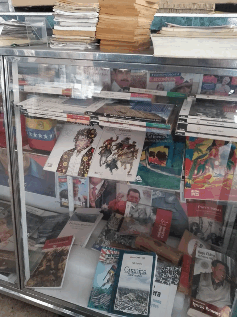Otra exhibición que se puede encontrar en la comuna es la variedad de libros en una de sus vitrinas, superpuestos unos sobre otros, distribuidos en columnas, que no permiten apreciar el titulo de los mismos. Detrás de ellos y pegados a la pared del estante se ven diferentes volantes políticos.
