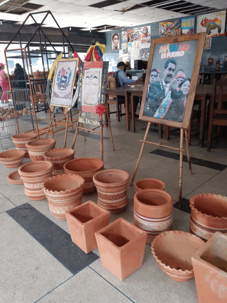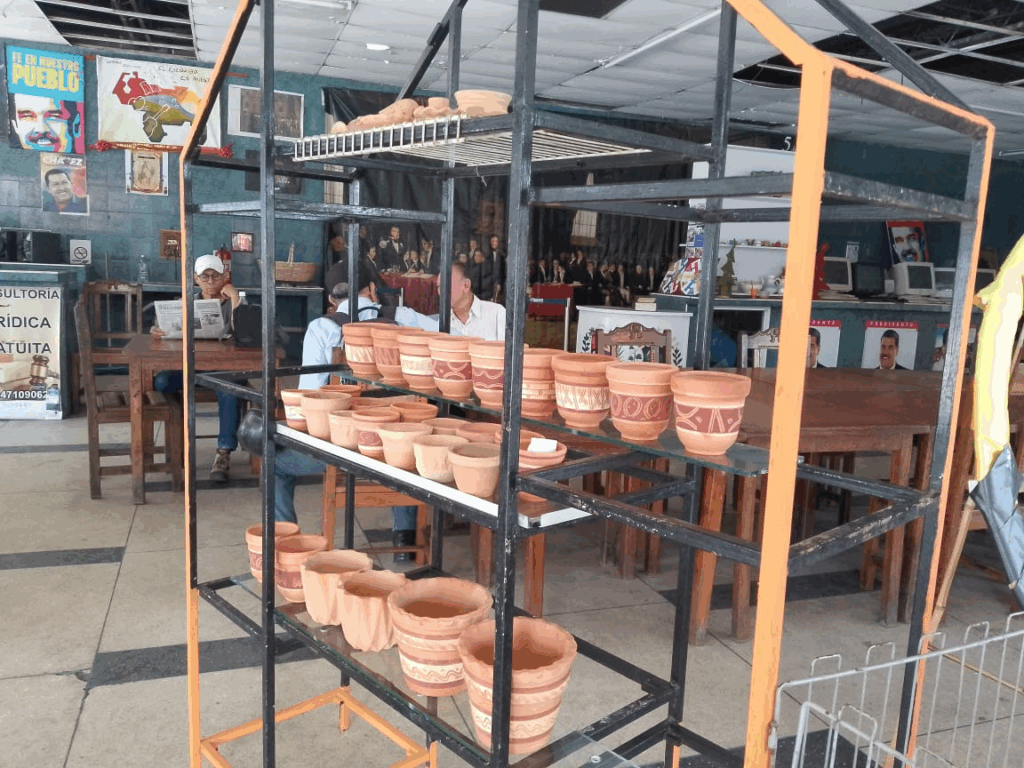 Distribuidas a lo largo del local, las artesanías capturan la atención de los asistentes. Hay jarrones de arcilla de distintos tamaños y diseños, algunos decorados con plantas, de las llamadas Suculentas,  y otros están   vacíos, esperando un nuevo uso. El conjunto se asemeja a una pequeña exposición, una colección que convive con las franelas dispuestas sobre los espaldares de varias sillas del lugar.