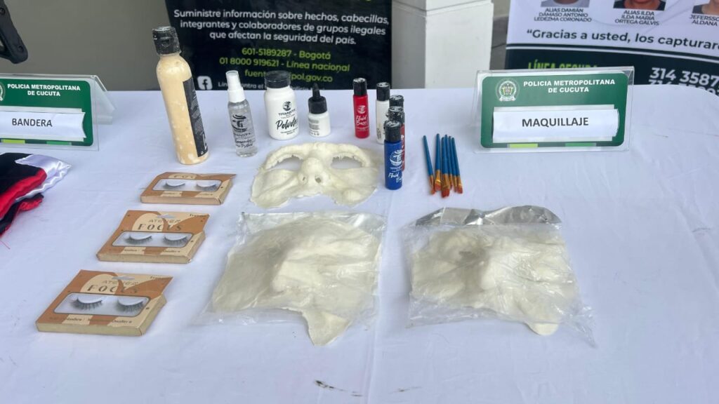 «En el operativo, se incautaron un fusil, tres proveedores para fusil y pistola, 78 cartuchos, una bandera alusiva al ELN, 13 celulares; también se incautaron tres máscaras de látex, maquillaje corporal profesional y elementos para caracterización, los cuales utilizaban para cambiar su apariencia al momento de cometer los actos delincuenciales y así evadir a las autoridades», reza el reporte de la Policía.