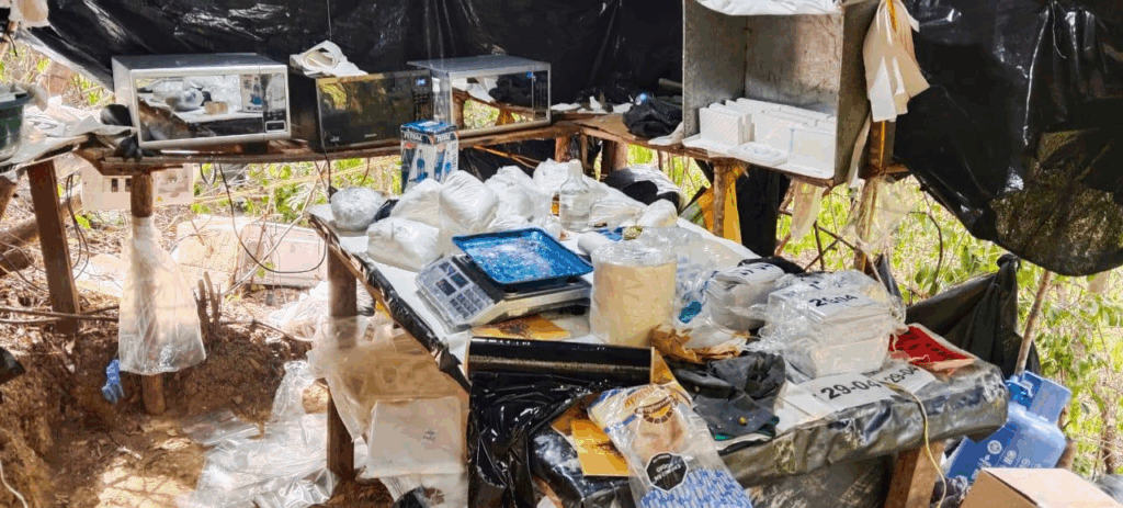 Asimismo, hallaron 992 galones de clorhidrato de cocaína en suspensión y 521 kilogramos de clorhidrato de cocaína sólida. También estaban los equipos industriales y maquinaria con las que se realizaba esta labor ilícita de proceso, secado y empaque del alucinógeno.