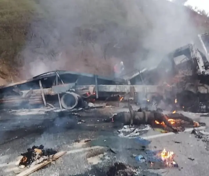 El choque frontal ocurrió a las 6 de la mañana, entre un camión 721 cargado de hortalizas y un vehículo F 350 que transportada carbón vegetal. Tras el impacto, se generó un incendio que envolvió ambas unidades y que dificultó las labores de rescate.